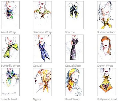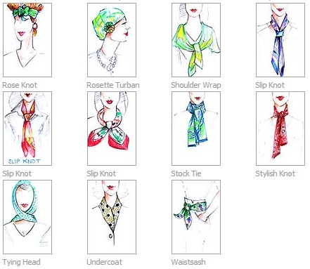 E para quem não vive em um local agraciado com inverno {como eu}, não é o fim do mundo. Existem maneiras de utilizar os lenços mesmo quando não há necessidade de proteger o corpo do frio. As imagens abaixo mostram diversas maneiras para usá-los, e foram retiradas do site Texere Silk. {No próprio site e possível ver um passo a passo de como amarrar os lenços, clicando em cima das imagens correspondentes}.