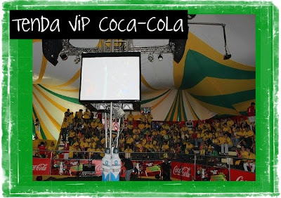 Chegando na entrada da tenda, a equipe de animadores já estava cantando o hino da Coca – que eu amoooooo – e eu já fiquei animada e com aquele friozinho na barriga. {Sério, me emociono quano escuto “give me freedom, give me fire, give me a reason, take me higher…}. Ainda na entrada recebi sandálias personalizadas {presente da São Mateus}, bandeira, fichinhas para consumir petiscos no bar, pacotes de Club Social e montes de adesivos. Era tanta coisa que nem deu pra tirar a câmera da bolsa nessa hora para registrar a entrada.