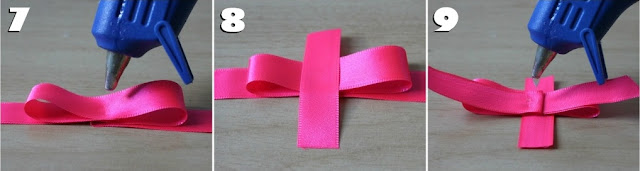 7. Aplique cola quente no meio do laço, na parte da frente. 8. Corte um pedaço de 7 cm da fita e cole no meio, formando uma cruz. 9. Enquanto a cola esfria na frente, aplique cola quente na parte de trás do laço, também no meio. / 7. Apply hot glue to the outter middle side of the ribbon. 8. Then cut a 3 in piece of the same ribbon and stick it to the middle, as if forming a cross. 9. While you wait the glue on the outter middle to get cold, apply hot glue at the inner middle side.
