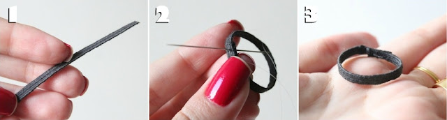 1. Corte um pedaço de 7 cm do elástico. 2. Faça um círculo e costure as partes que se encontram. 3. Fica como um anel. / 1. Cut the elastic in a piece of 2.8 in. 2. Make a circle out of it and stitch the ends. 3. It should look like a ring.